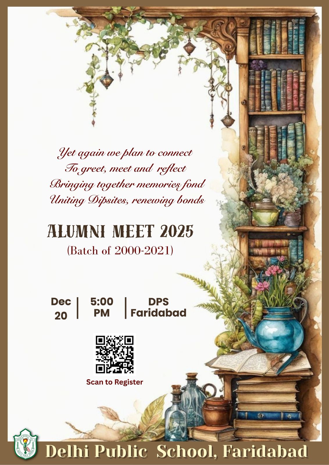 DPS Faridabad calls upon its batches of 2000 to 2021, to come home to their Alma Mater on Saturday, December 20, 2025 at 5:00 p.m. at the School premises.